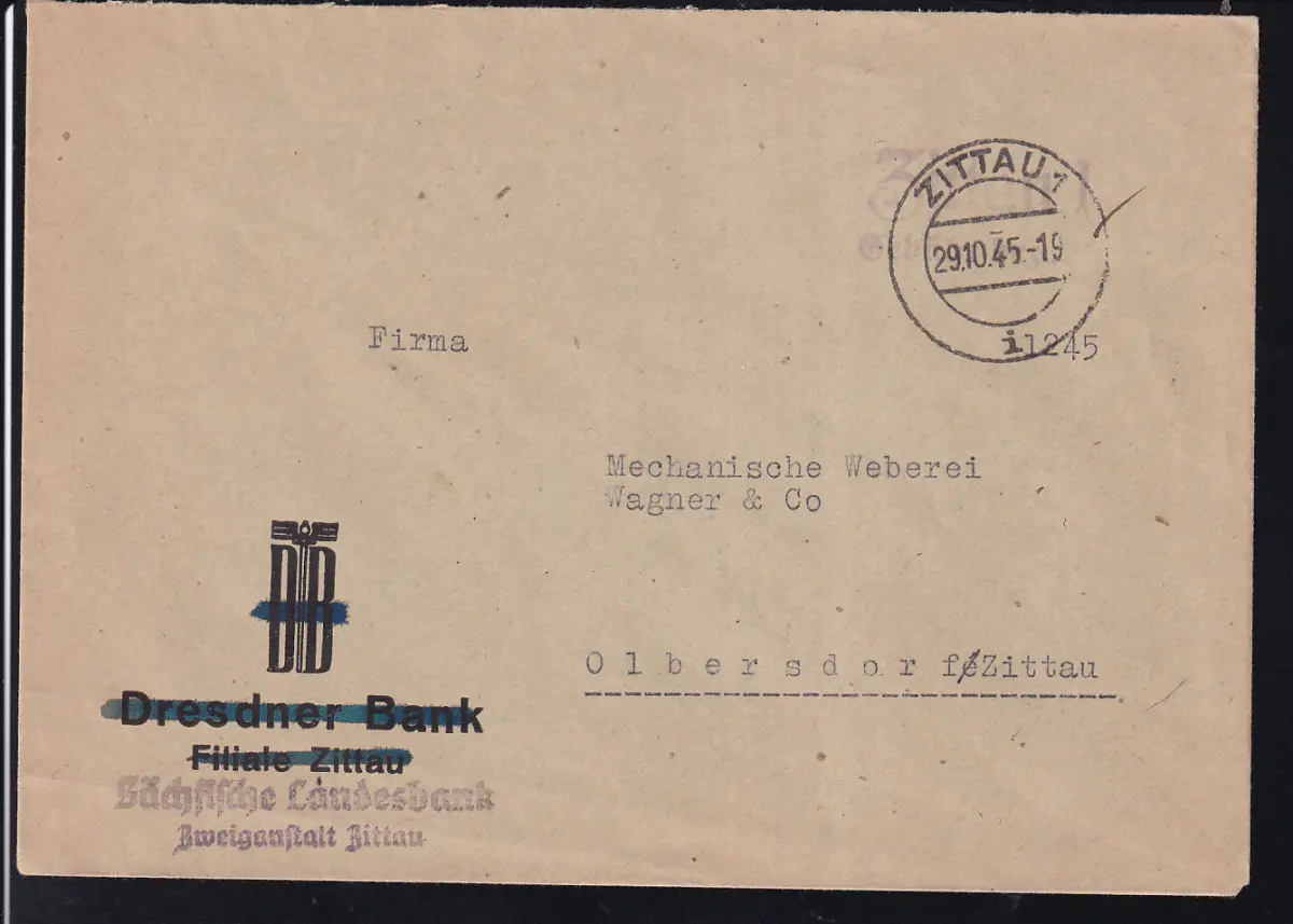 ZITTAU 1 i 29.10.9.45 + L2 Zittau 1 Gebühr bezahlt auf Brief der Sächsischen Landesbank Zweiganstalt Zittau