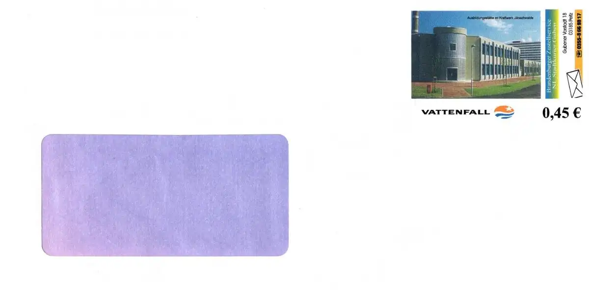 • MichSeite ZSBB: MiNr. UB 2, 04.10.2004, "VATTENFALL", Ganzsache (Umschlag), ungebraucht Beschreibung \nAusgabeland: Bundesrepublik Deutschland \nPostdienstleister: Zustelldienst, Peitz \nAusgabeanlass: Ganzsachenausgabe ""VATTENFALL: Ausbildungsstätte im Kraftwerk Jänschwalde" Katalognummer: MiNr. UB 2 Ausgabedatum: 04.10.2004 Nominale: Satz (1 Ganzsache) zu 0,45 EUR \nTyp: - \nErhaltung: ungebraucht \nHinweis: - Thema: Energie, Braunkohle, Verstromung, Lausitz