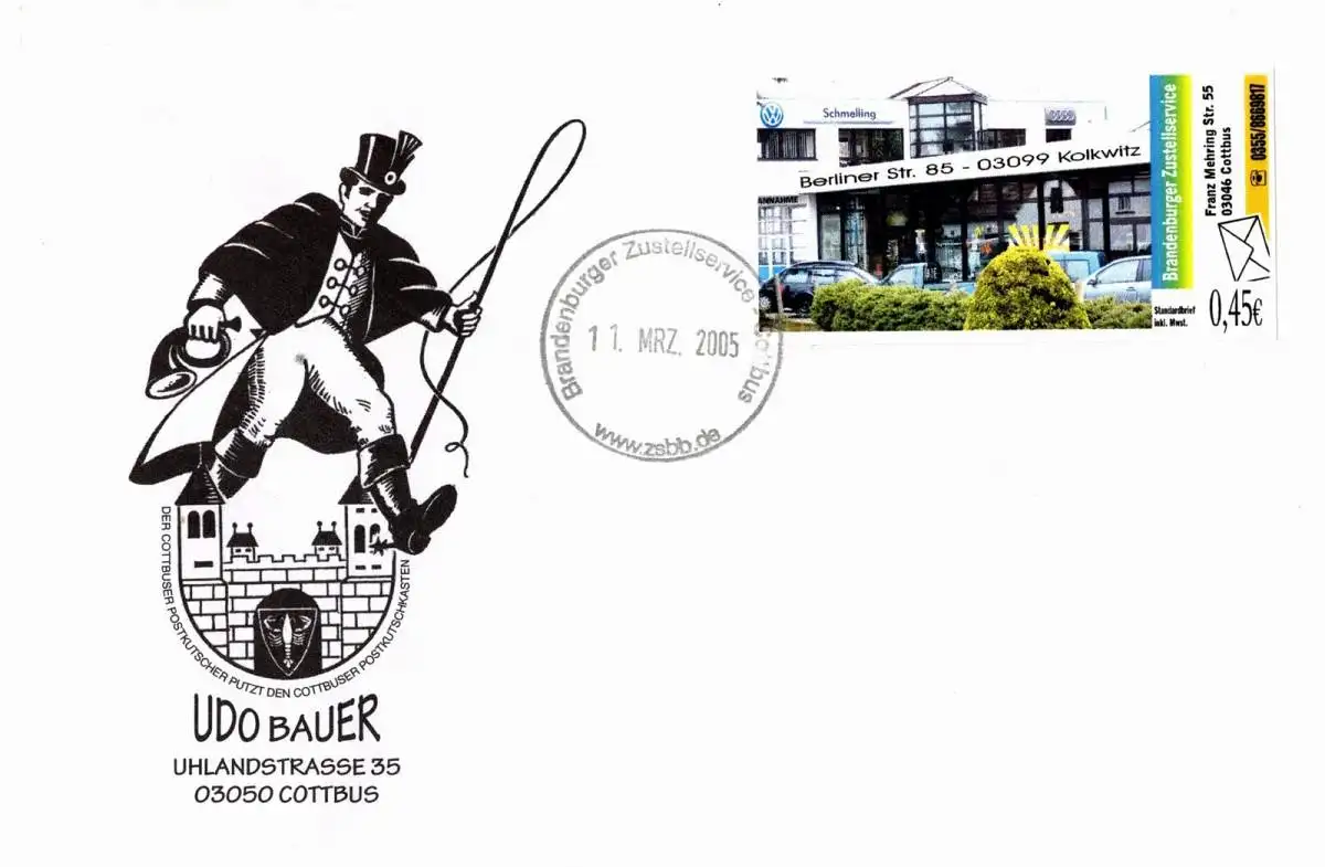 • MichSeite ZSBB: Nr. 1, 00.00.2004, "ZSBB Cottbus", Ganzstück (Umschlag), Tagesstempel ZSBB Beschreibung \nAusgabeland: Bundesrepublik Deutschland \nPostdienstleister: Brandenburger Zustellservice, Cottbus \nAusgabeanlass: Briefmarkenausgabe "ZSBB Cottbus: Autohaus VW Schmolling" Katalognummer: Nr. 1 Ausgabedatum: 00.00.2004 Nominale: Wert zu 0,45 EUR \nTyp: - \nErhaltung: Ganzstück (Umschlag), Tagesstempel ZSBB vom 11.03.2005 \nHinweis: - Thema: Lausitz, Autohaus, Fahrzeuge