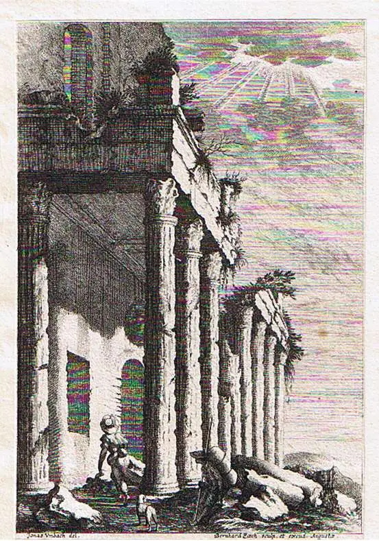 Nagler 3. - Aus der 17 Blätter umfassenden, zart gestochenen Radierungsfolge von Landschaften, Ruinen und Brunnen "Ruinorum harum Inventari" des Augsburger Radierers und Stichverlegers Zaech nach Jonas Umbach. - Knapp um die Einfassungslinie beschnitten. - Provenienz: Sammlung der Fürsten von Liechtenstein. - Versandkosten auf Anfrage