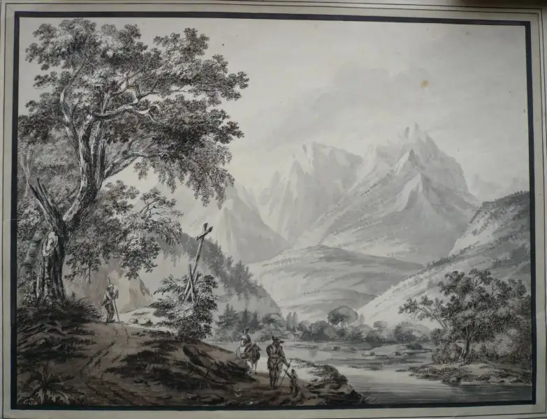 Großformatige stimmungsvolle Landschaftsstudie, die im Vordergrund fein mit der Tuschfeder ausgeführt ist. Ein alter blatthoher Baum bietet den Wanderern Schutz. Einer von ihnen hält vor einem großen Holzkreuz am Wegesrand Andacht. Das Hochgebirge im Hintergrund (wohl Glarner Alpen) ist durch transparente Pinselstriche herausgearbeitet und verschwimmt in der Ferne. Von mehreren unterschiedlich breiten Tuschlinien eingefaßt. - Randschäden und kleinere Einrisse, teils bis in die Einfassung reichend, z. T. hinterlegt. Fehlstelle in der unteren rechten Ecke. Eine Knickspur in der unteren rechten Ecke