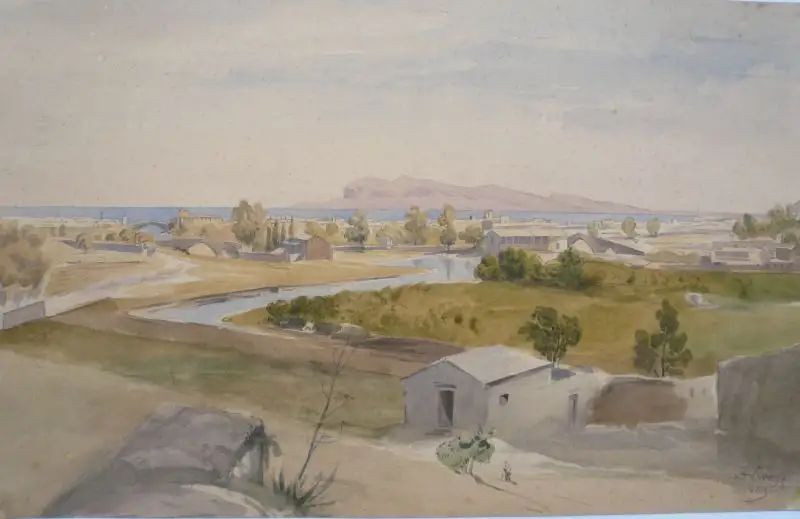 Von einem etwas erhöht liegenden Betrachterstandpunkt aus fällt der Blick auf den Küstenabschnitt am Rand einer südlichen Stadt. Im Hintergrund zeigt sich ein gebirgiger Küstenabschnitt. In zarten, vorwiegend erdigen Farben aquarellierte, impressionistisch aufgefasste weite Landschaft. - Durchgehend mit kleinen Stockflechen