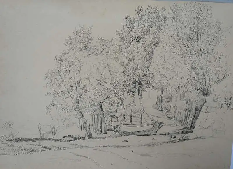 Bildhaft und in leichter Untersicht gezeichneter Landschaftsausschnitt mit einem Weg der am rechten Bildrand an einem Haus vorbei, in die Tiefe führt. Mit schnell gezeichneten Schlaufen entstehen vor dem Auge des Betrachtes die dicht belaubten Bäume. - Schwach fleckig, teilweise kleinere Läsuren in den Ecken