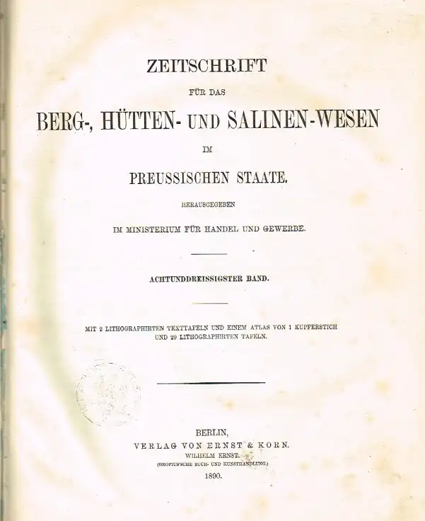 Bemerkungen: Zustand: Einband berieben, besonders Ecken und Kanten, Rückenschild mit Fehlstellen // Herausgegeben von Ministerium für Handel und Gewerbe. Mit einer Lithografie, die Dr. H. von Dechen abbildet, und umfangreichem Atlasteil mit 29 Tafeln