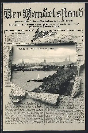 Zeitungs-AK Hamburg-Neustadt, Der Handelsstand, Lombardsbrücke mit Stadt durch zerrissenes Papier