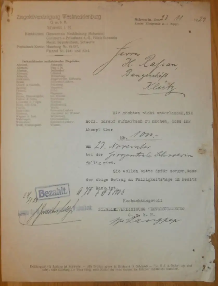 Ziegelei-Vereinigung Schwerin i.M. , 1929 , Klütz , Mecklenburg !!AZ-WR/1o