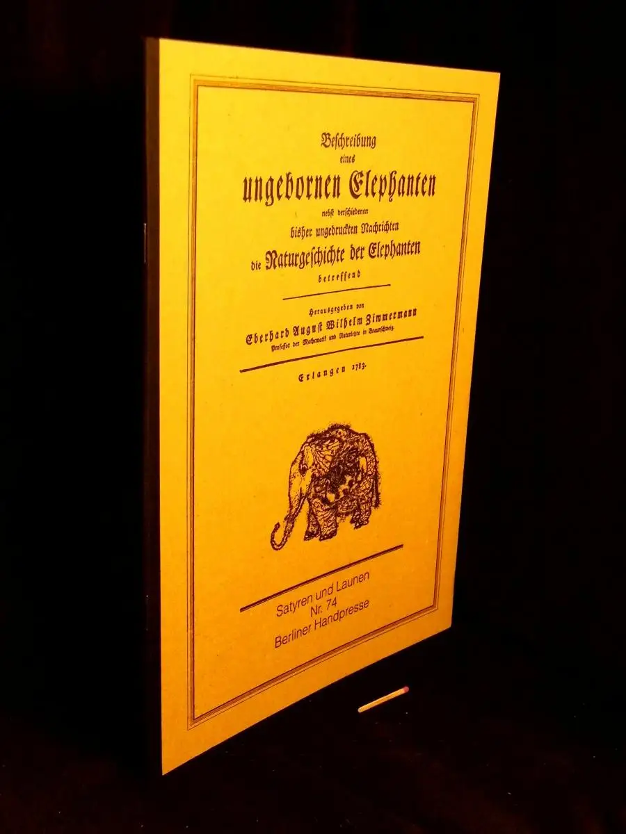 Zimmermann, Eberhard August Wilhelm (Herausgeber): Beschreibung eines ungebornen Elephanten nebst verschiedenen bisher ungedruckten Nachrichten die Naturgeschichte der Elephanten betreffend. Erlangen 1783 - aus der Reihe: Satyren und Launen - Band: 74 LA