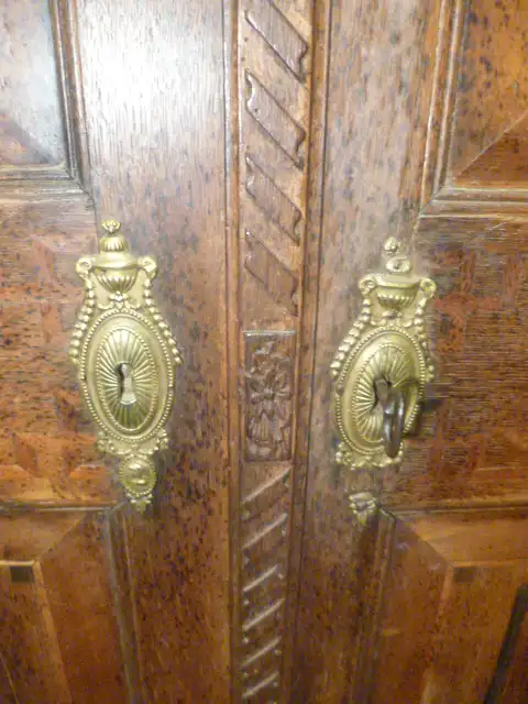 mit abgeschrägten Lisenen und kassettierten Türen und Seiten sowie profiliertem Gesims. Die Lisenen und die Schlagleiste ist mit geschnitzten Flechtbandmotiven dekoriert und auf halber Höhe durch ausgeprägte Rosetten akzentuiert. Die Gesimszone ist umlaufend mit Würfelfries und die Füllungsfelder der Türen zeigen Sternintarsien mit Blumenbouquets und Festons. Eiche massiv.