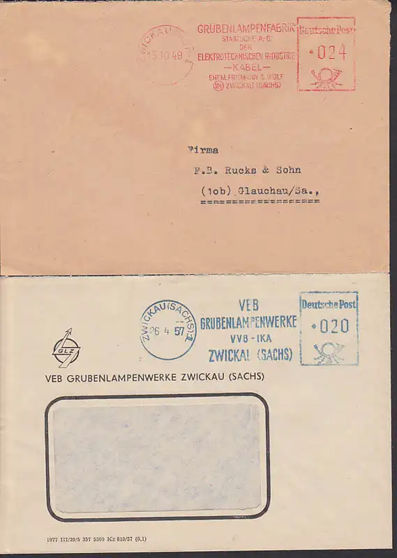 Zwickau Grubenlampenwerke AFS in rot und blau, versch. Eindrucke, Bergbau Montan