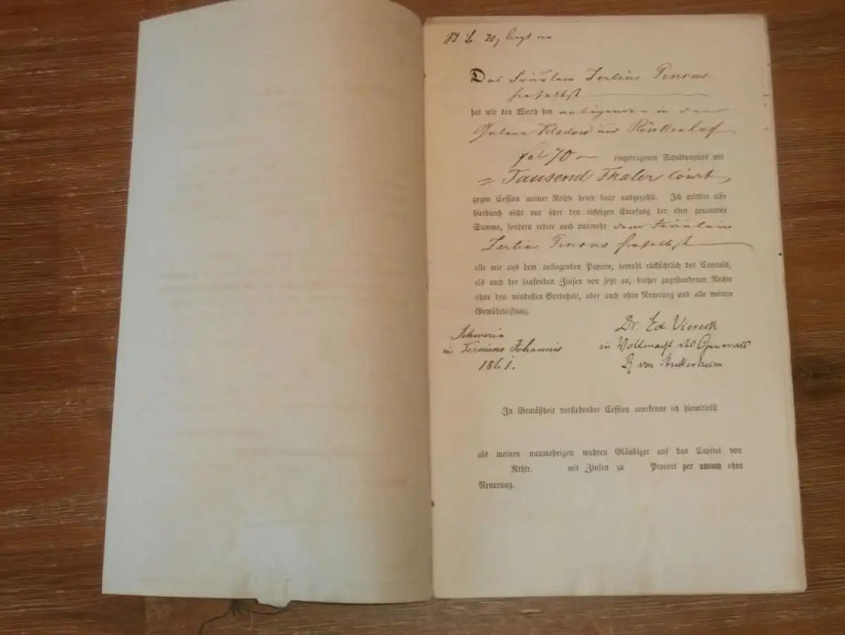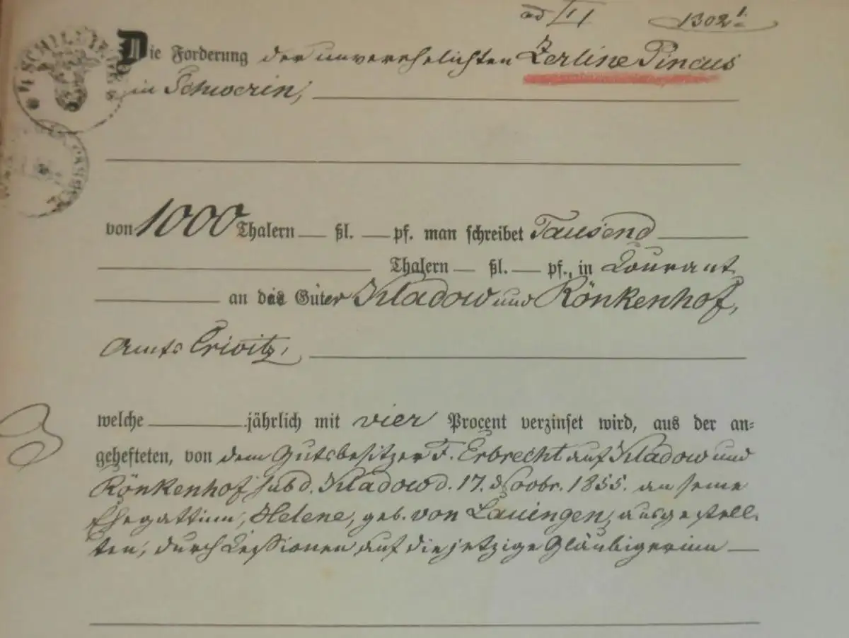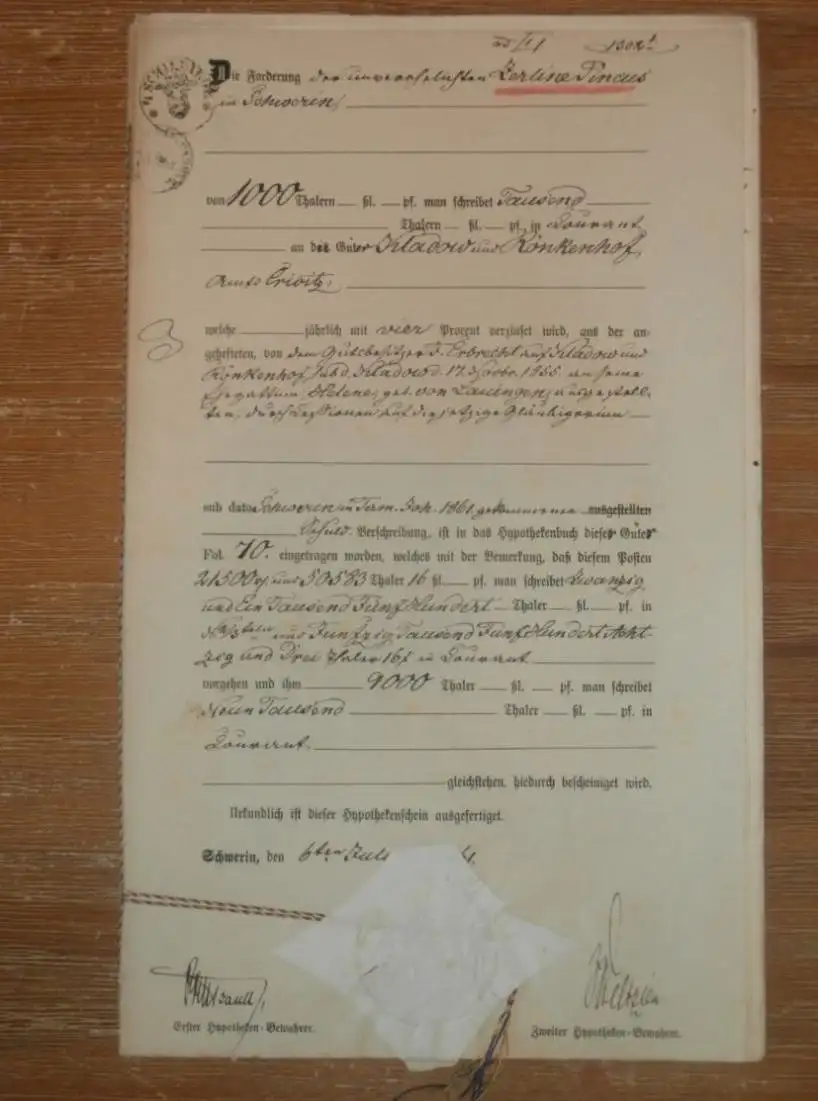 alte Akte - 1861, Zerline Pincus in Schwerin , Kladow und Rönkenhof bei Crivitz i. Mecklenburg , von Lauingen !!