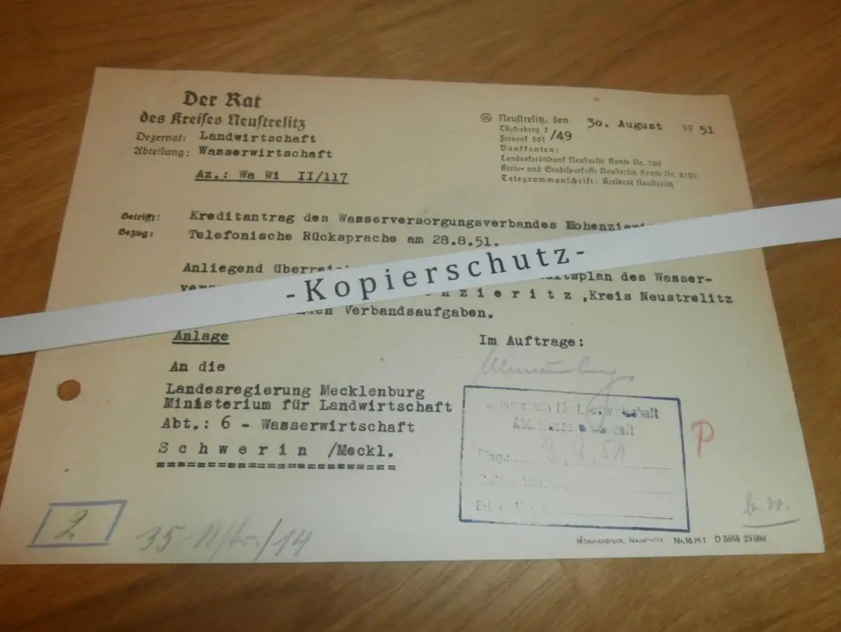 altes Dokument - Hohenzieritz / Neustrelitz in Mecklenburg , 1951 !!!