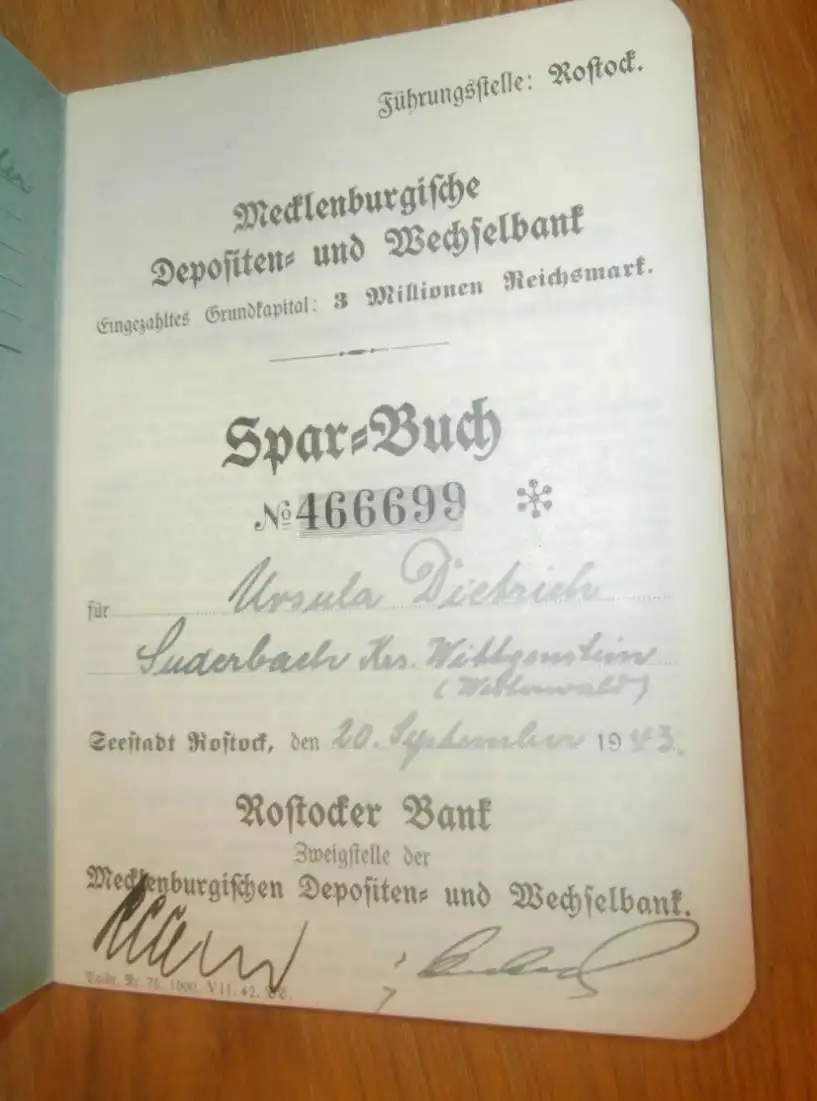 altes Sparbuch Rostock , 1943 , Ursula Dietrich in Puderbach b. Wittgenstein i. Westerwald , Bad Laasphe , Sparkasse