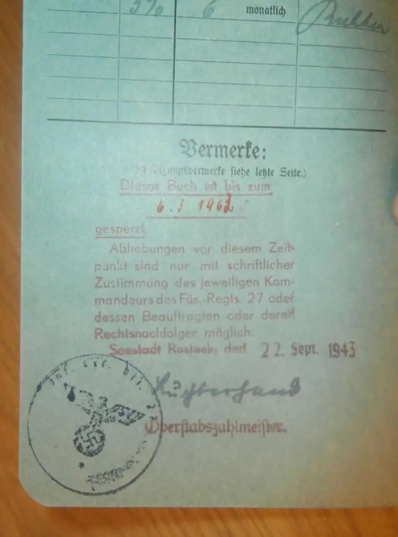 altes Sparbuch Rostock , 1943 , Ursula Dietrich in Puderbach b. Wittgenstein i. Westerwald , Bad Laasphe , Sparkasse AZ-SP3/WR6