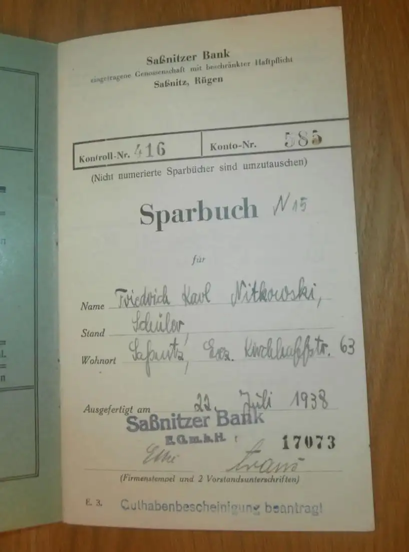 altes Sparbuch Saßnitz, 1938 - 1942 , Friedrich Karl Nitkowski in Saßnitz i. Mecklenurg , Sparkasse , Bank !!