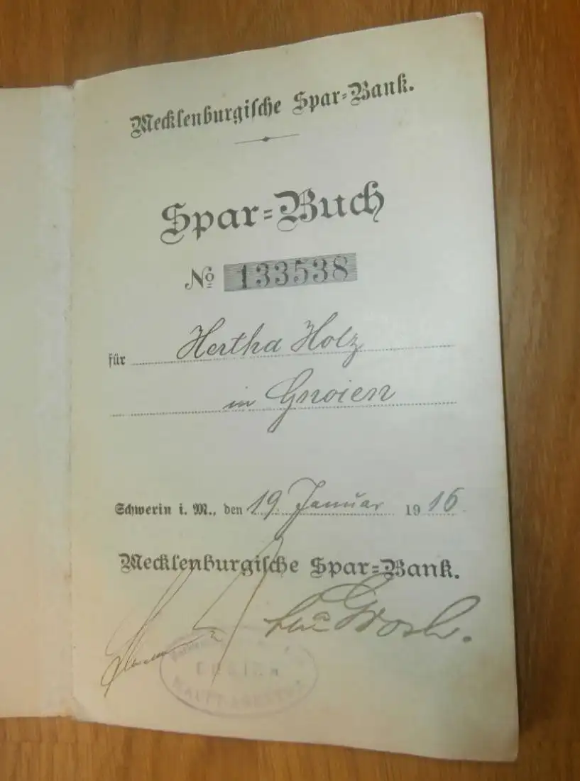 altes Sparbuch Schwerin , 1916 - 1920 , Hertha Holz in Gnoien i. Mecklenburg , Sparkasse , Bank !!