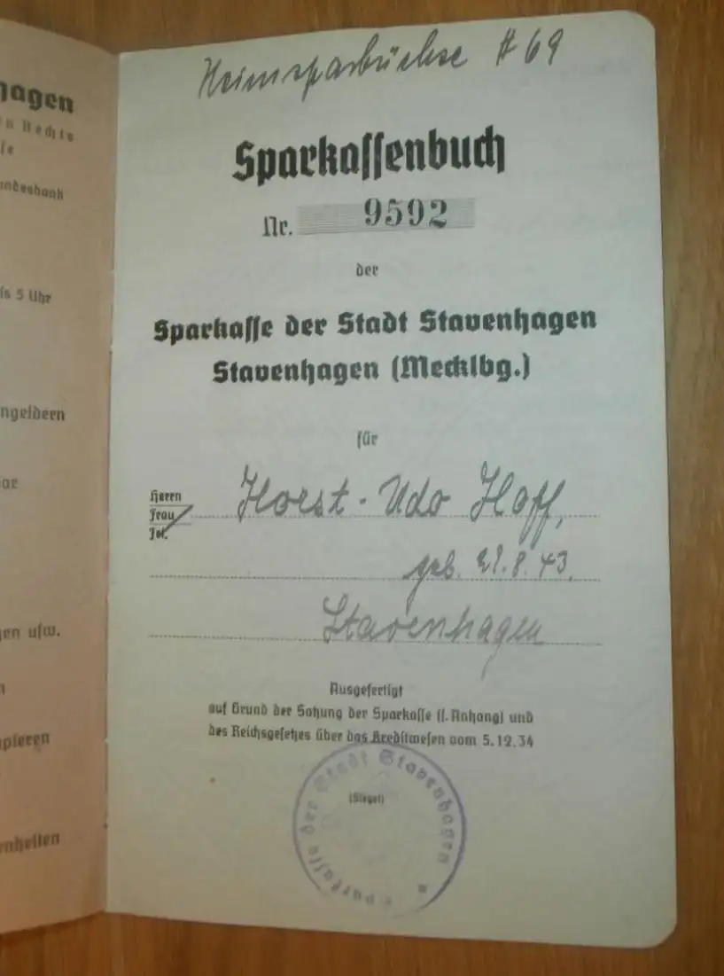 altes Sparbuch Stavenhagen , 1944 - 1945 , Horst Udo Hoff in Stavenhagen i. Mecklenurg , Sparkasse , Bank !!AZ-SP3/WR6