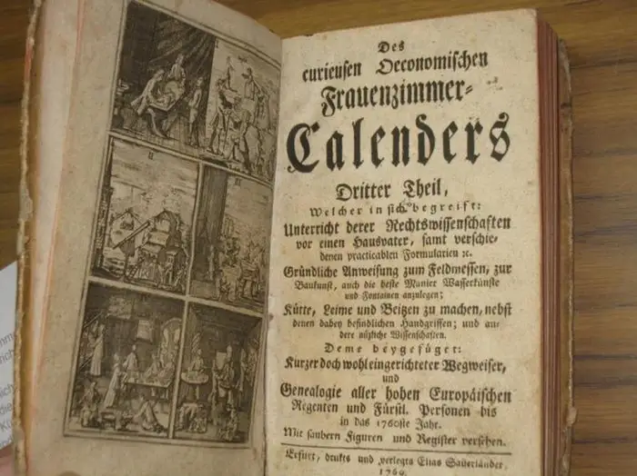 Titel: Des curieusen Oeconomischen Frauenzimmer-Calenders Dritter Theil, welcher in sich begreift: Unterricht derer Rechtswissenschaften vor einen Hausvater, samt verschiedenen practicablen Formularien etc. Gründliche Anweisung zum Feldmessen, zur Baukunst, auch die beste Manier Wasserkünste und Fontainen anzulegen; Kütte, Leime und Beitzen zu machen, nebst denen dabey befindlichen Handgriffen; und andere nüptzliche Wissenschaften. Deme beygefüget: ... Genealogie aller hohen Europäischen Regenten und Fürstl. Personen bis in das 1760ste Jahr. Mit saubern Figuren und Register Versehen
