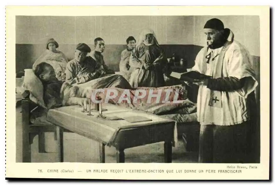 chine (chefoo) Cartes postales un malade recoit l&#39extreme onction que lui donn eun pere fransicain (china)