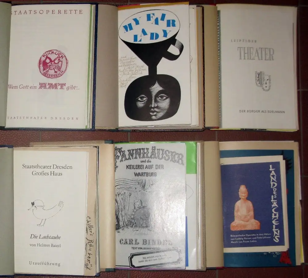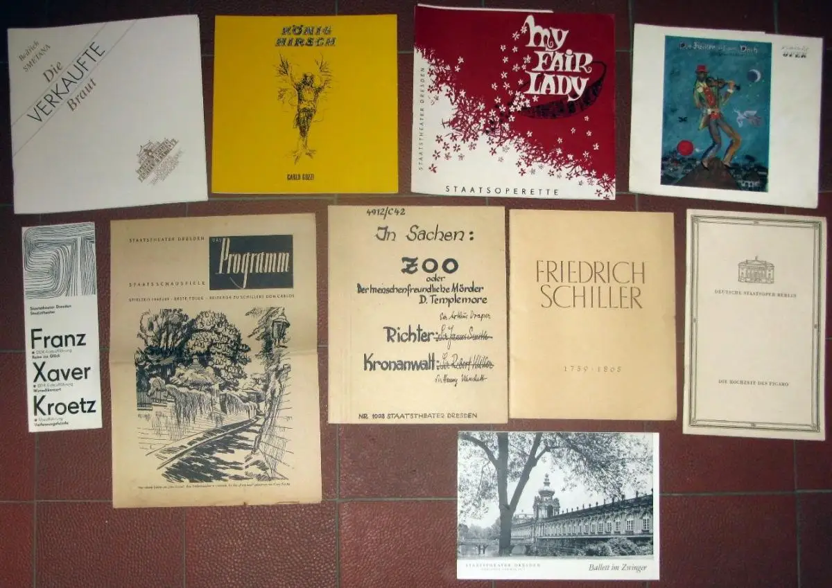 guter bis sehr guter Zustand, geringe Gebrauchs- und Alterungsspuren: überwiegend in Klemmmappen mit leichten Druckspuren entlang des Rückens - selten kleine Blessuren an Ecken oder Rändern - teils quer oder längs geknickt, Sie erhalten 6 Klemmmappen und einige lose Programme, einige Uraufführungen, selten liegen auch noch die Eintrittskarte bei - 2x Semperoper 1985/1993 - 1x Landesbühnen Sachsen 1983/84 - 8 Programme Staatstheater Dresden - Großes Haus 1974-1982 - 3 Programme Staatstheater Dresden - Kleines Haus 1974-1978 - 1 Programm Staatstheater Dresden - Studiotheater 1977 - 1 Programm Staatstheater Dresden - Ballett im Zwinger 1977 - 6x Deutsche Volksbühne Dresden 1949/50 - 1x Volksoper Dresden 1949 - 4x Staatsschauspiel Dresden 1948-1983 - 1x Theater der Jungen Generation Dresden 1956/57 - 62x Staatsoperette Dresden bzw. Operetten-Theater 1951-1979 - 6x Metropol-Theater Berlin 1954 bis 1966/67 - 6x Deutsches Theater Berlin 1954/55 bis 1972 - 1x Deutsch-Sorbisches Volkstheater Bautzen 1969/70 - 2x Bühnen der Stadt Magdeburg 1964/65 bis 1970/71 - 8x Berliner Ensemble 1960-1974 - 4x Komische Oper Berlin 1962-1976 - 3x Deutsche Staatsoper Berlin 1962-1983 - 2x Städtische Bühnen Erfurt 1965/66-1981 - 5x Leipziger Theater 1959-1983 - 1x Mecklenburgische Staatstheater Schwerin 1978 - 1x Theater Putbus 1954/55 - 1x Gerhart-Hauptmann-Theater Görlitz 1962/63 - 1x Volksbühne am Luxemburg-Platz Berlin 1971/72, kartoniert / Softcover, zahlreiche Seiten mit einigen Bildern
