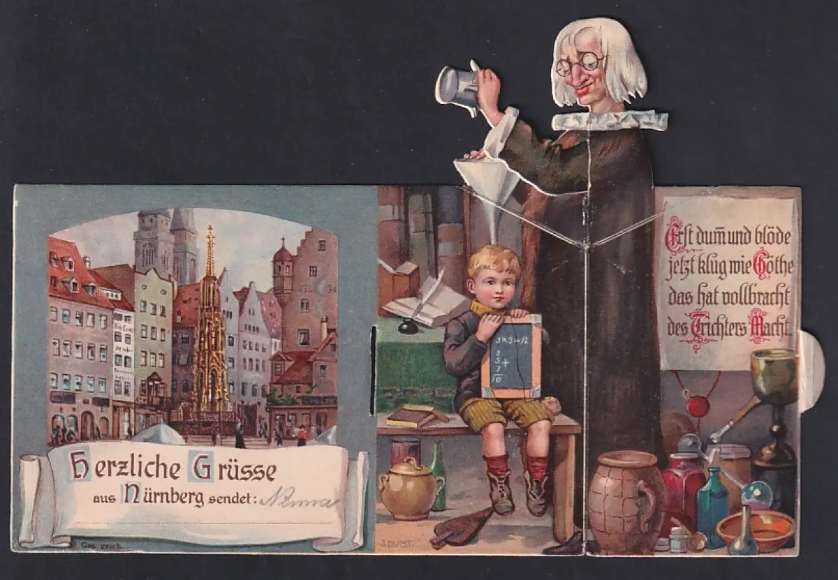 mechanische-AK Nürnberg, Ortsansicht, Lehrer mit Nürnberger Trichter und seinem Schüler, Antiblödin, Gehirnelexir