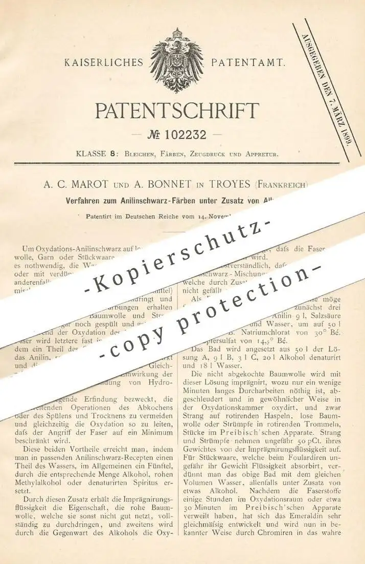 original Patent - A. C. Marot , A. Bonnet , Troyes , Frankreich 1897 | Anilinschwarz - Färben mit Alkohol | Preibisch