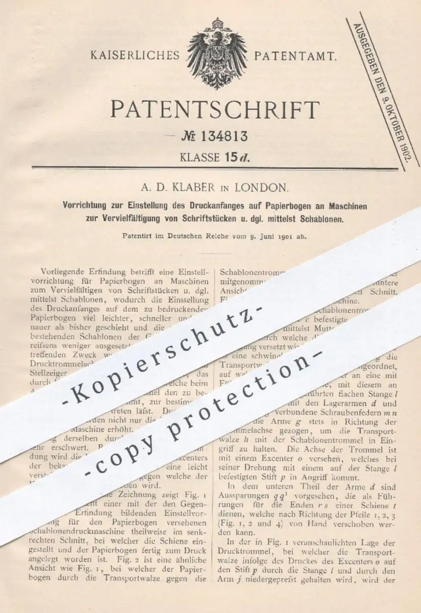 original Patent - A. D. Klaber , London , 1901 , Papierbogen zur Vervielfältigung von Schriftstücken | Kopierer , Druck
