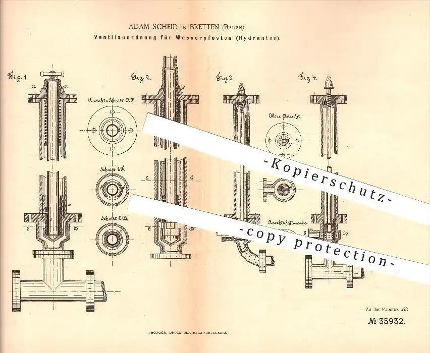original Patent - Adam Scheid in Bretten , 1885 , Ventile für Wasserpfosten , Hydrant , Wasserleitung !!!