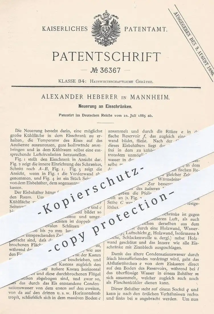 original Patent - Alexander Heberer , Mannheim , 1885 , Eisschrank | Kühlschrank , Eis , Kühlung , Kühlen !!