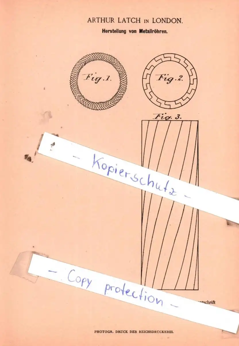 original Patent - Arthur Latch in London , 1885 , Herstellung von Metallröhren !!!