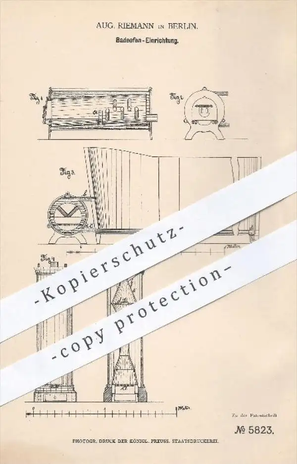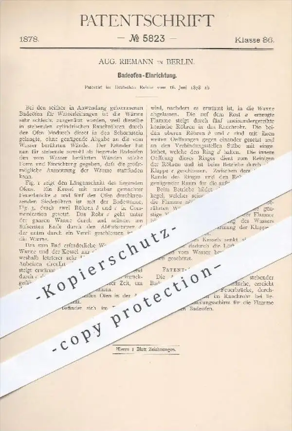 original Patent - Aug. Riemann , Berlin , 1878 , Badeofen | Ofen , Öfen , Heizung , Ofenbauer , Kessel , Rauchrohr !!!