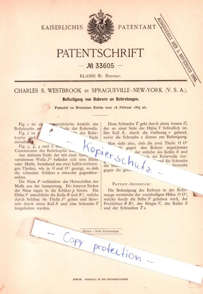 original Patent - Charles S. Westbrook in Spragueville , New-York , 1885 , Bergbau !!!