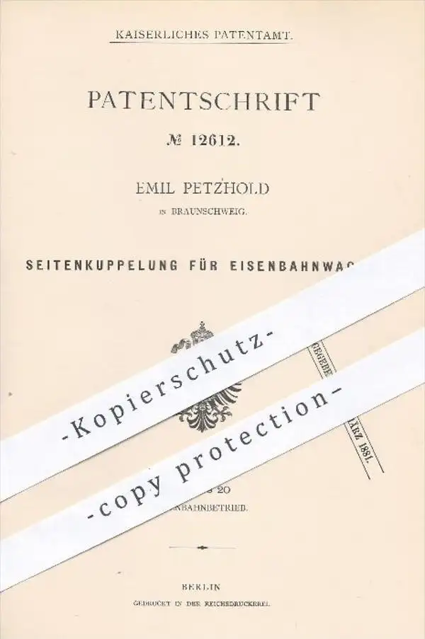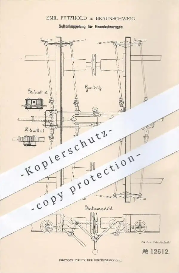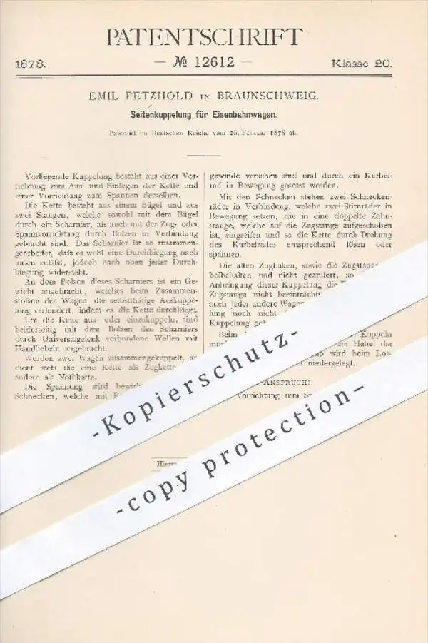 original Patent - E. Petzold , Braunschweig , 1878 , Seitenkupplung für Eisenbahnen | Eisenbahn , Kupplung , Lokomotive