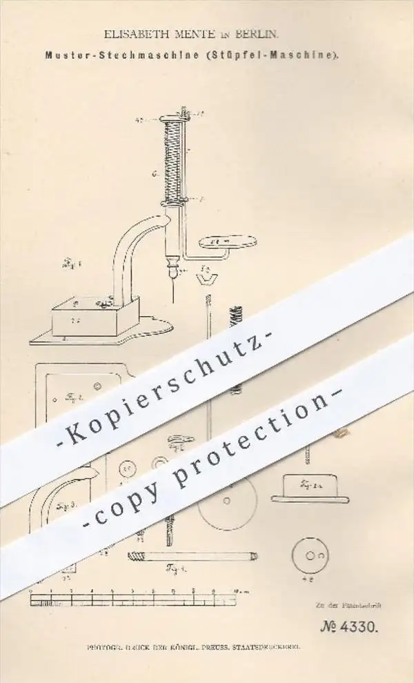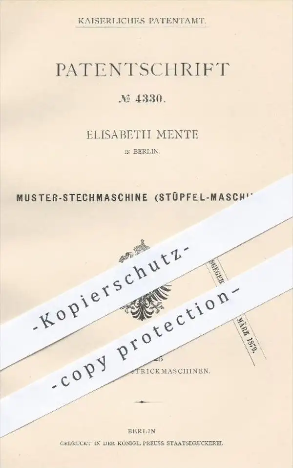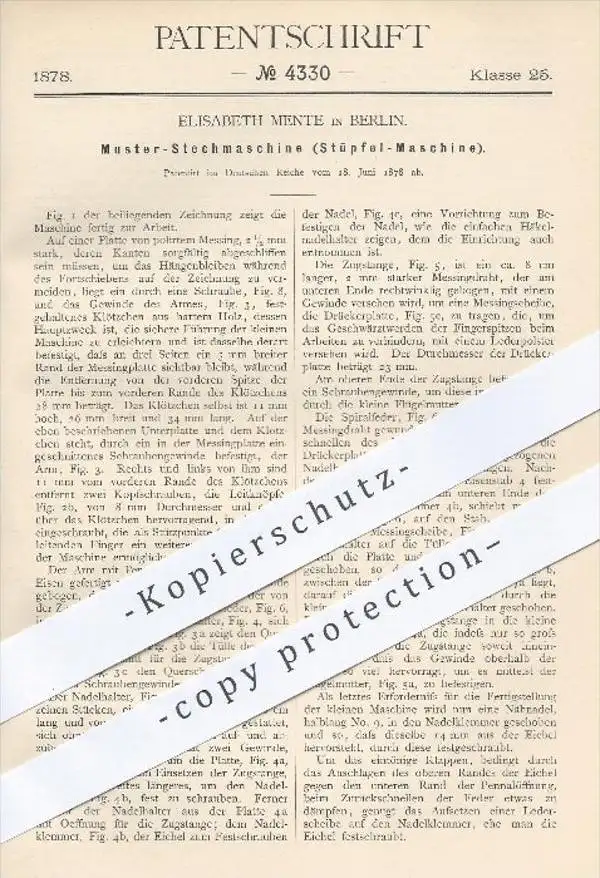 original Patent - Elisabeth Mente in Berlin , 1878 , Muster - Stechmaschine | Stüpfel - Maschine | Stopfen , Stricken !!