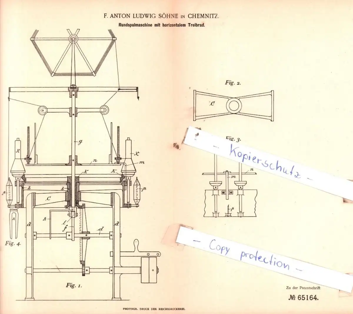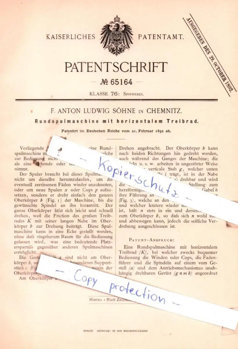 original Patent - F. Anton Ludwig Söhne in Chemnitz , 1892 , Rundspulmaschine mit Treibrand !!!