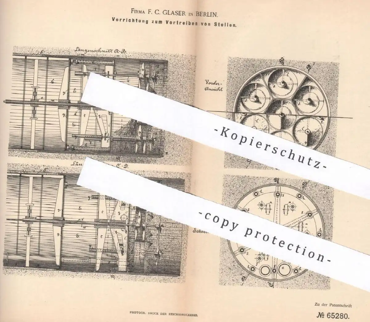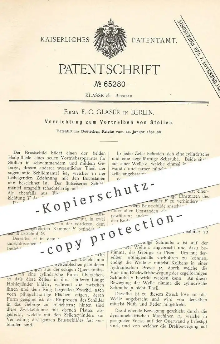 original Patent - F. C. Glaser , Berlin 1892 , Vortreiben von Stollen | Bergbau , Bergwerk , Bergarbeiter , Stollenwerk
