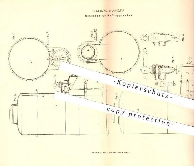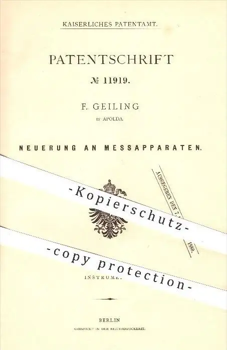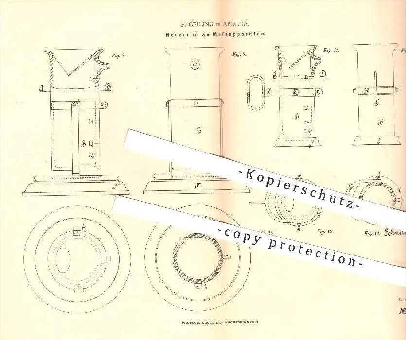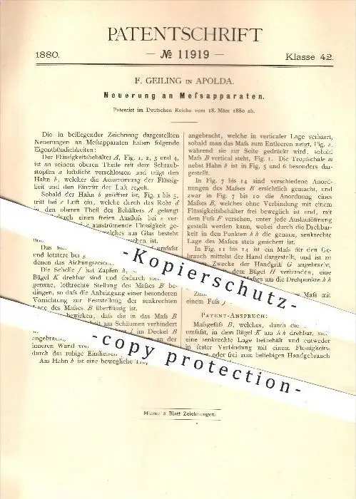 original Patent - F. Geiling in Apolda , 1880 , Messapparat , Messen , Messung , Flüssigkeit , Maß , Gefäße !!!