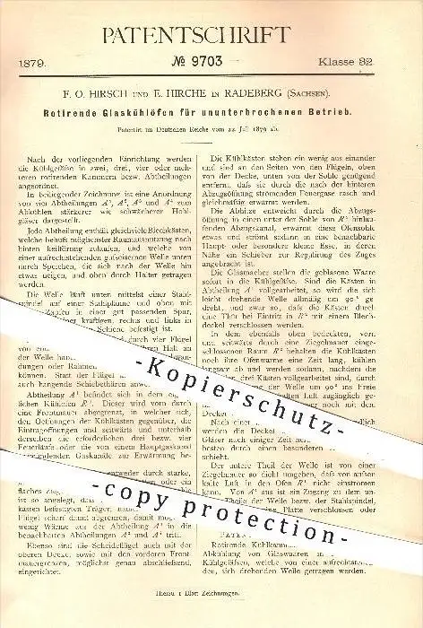 original Patent - F. O. Hirsch u. E. Hirche , Radeberg , 1879 , Rotierender Glaskühlofen , Kühlofen , Glas , Glasbläser