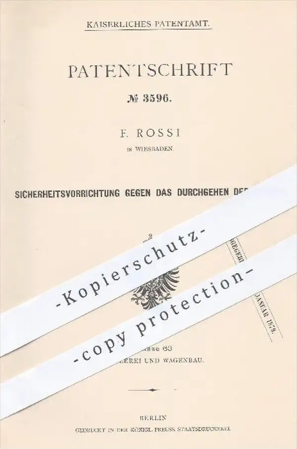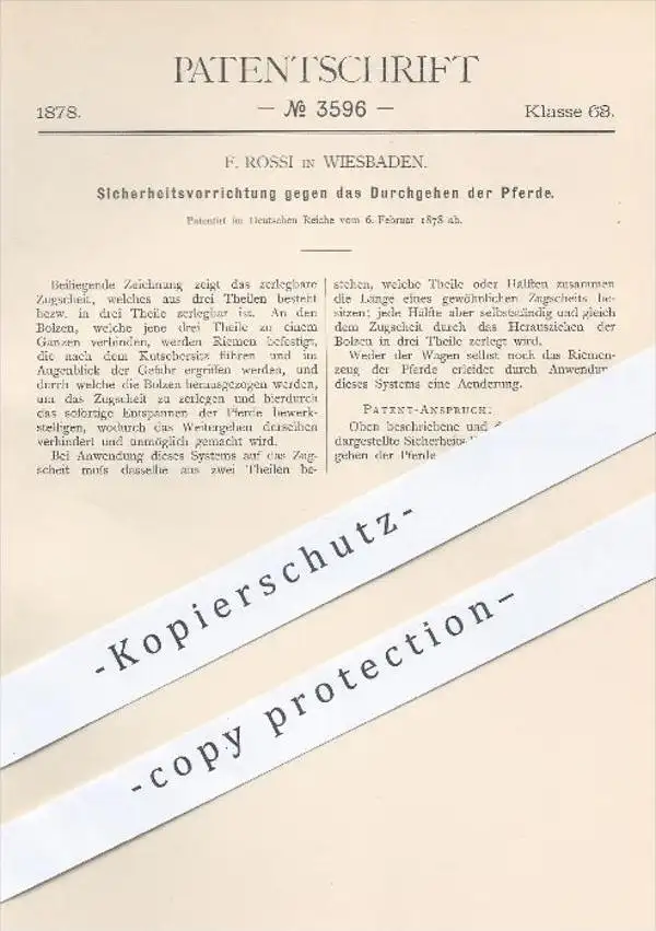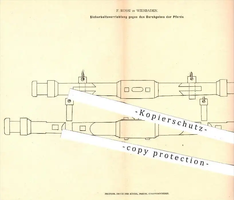 original Patent - F. Rossi , Wiesbaden , 1878 , Vorrichtung gegen das Durchgehen der Pferde | Pferd , Kutsche , Wagen !!