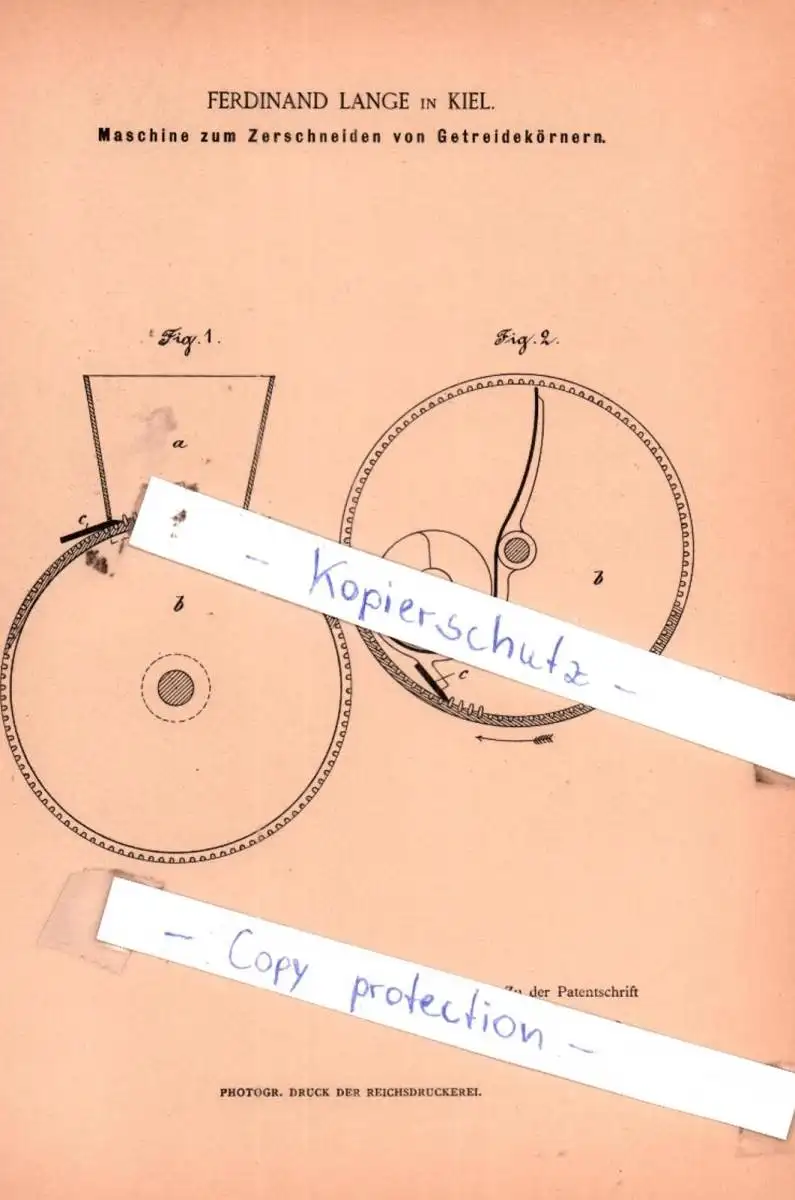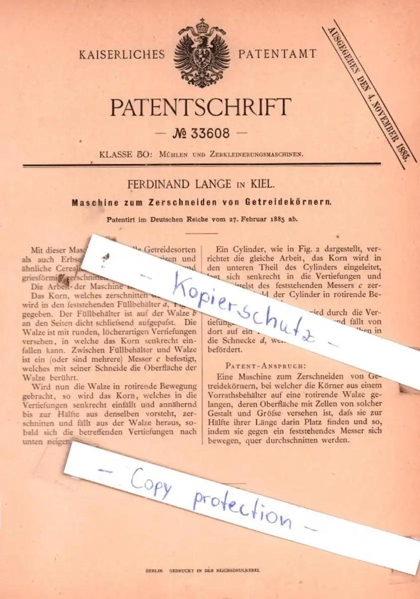 original Patent - Ferdinand Lange in Kiel , 1885 , Maschine zum Zerschneiden von Getreidekörnern !!!