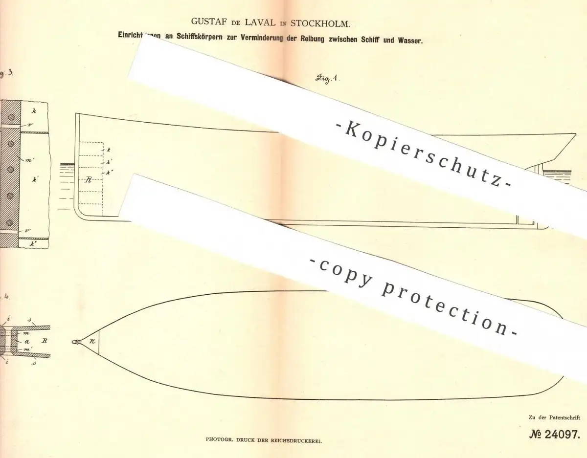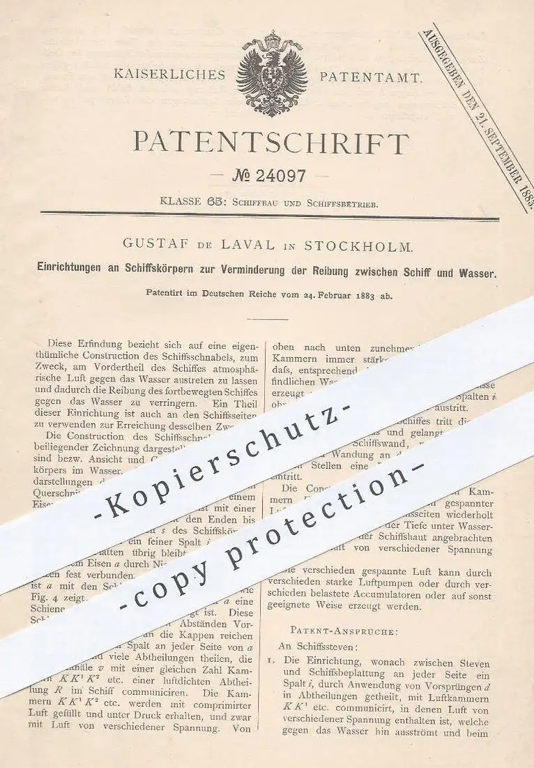 original Patent - Gustaf de Laval , Stockholm , Schweden , 1883 , Verminderung der Reibung zwischen Schiff u. Wasser !!