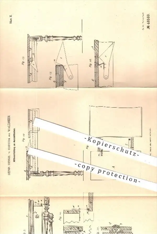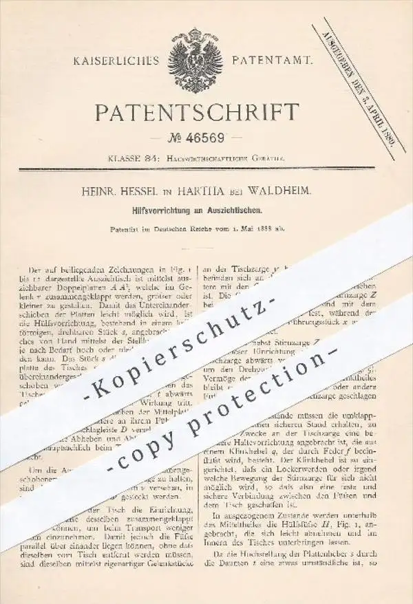 original Patent - Heinr. Hessel , Hartha /Waldheim , 1888 , Hilfsvorrichtung am Ausziehtisch | Tisch , Tische , Möbel !