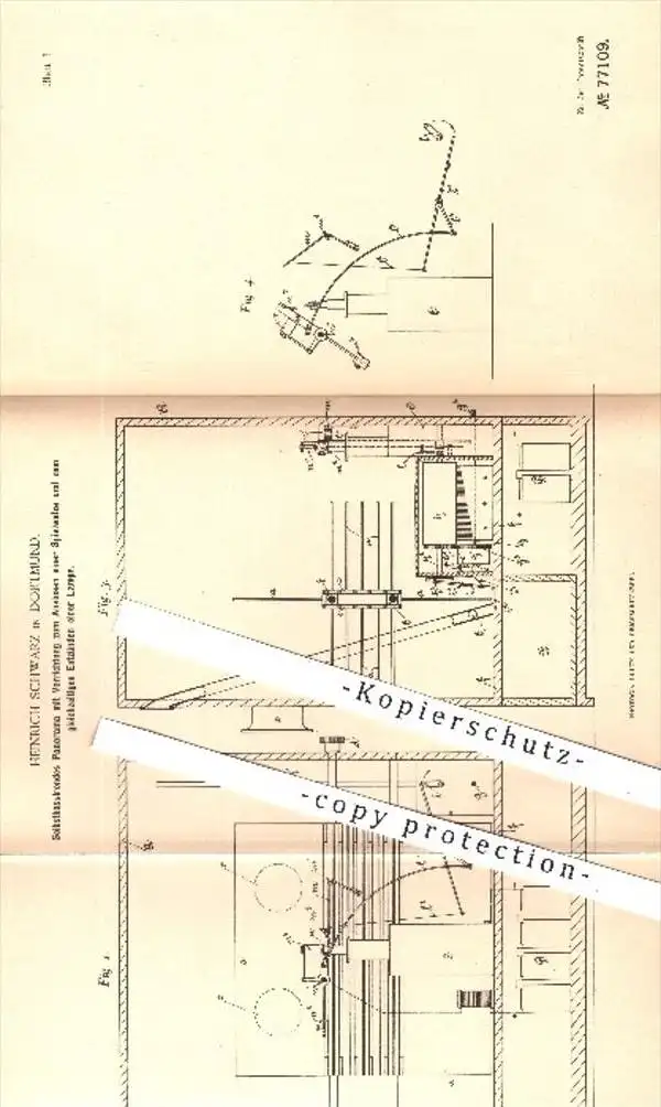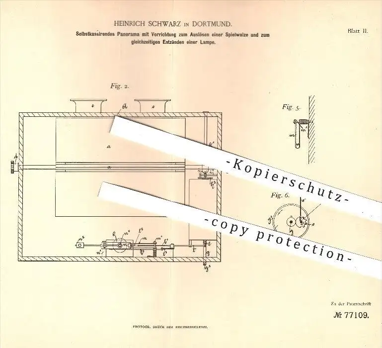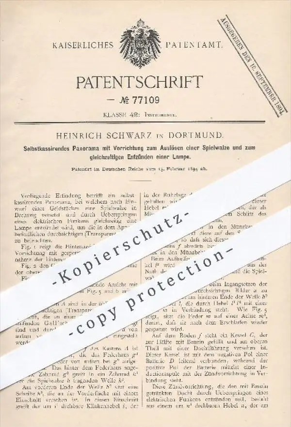 original Patent - Heinrich Schwarz in Dortmund , 1894 , Selbstkassierendes Panorama zum Entzünden einer Lampe | Licht !