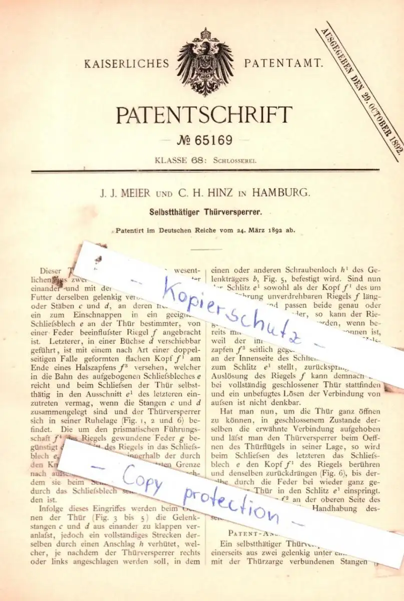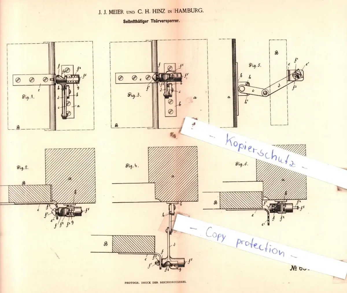 original Patent - J. J. Meier und C. H. Hinz in Hamburg , 1892 , Selbstthätiger Thürversperrer !!!