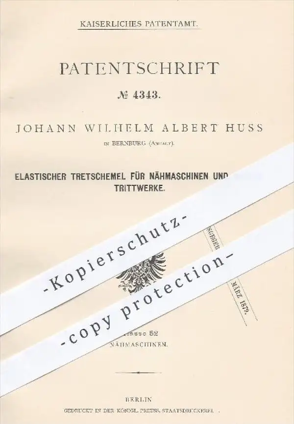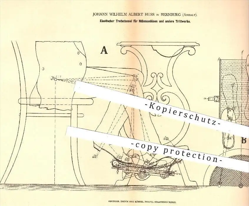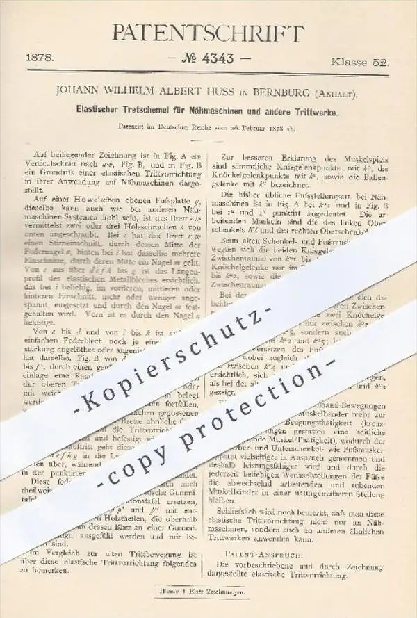 original Patent - J. W. A. Huss , Bernburg , 1878 , Elastischer Tretschemel für Nähmaschinen , Trittwerke | Nähmaschine