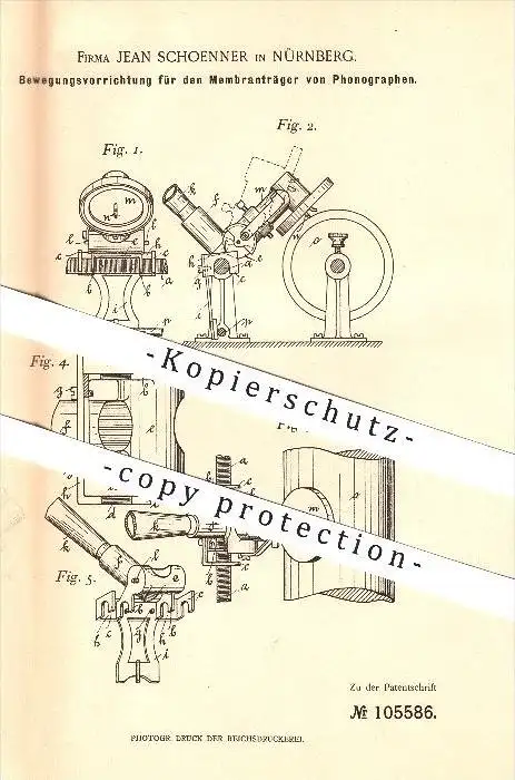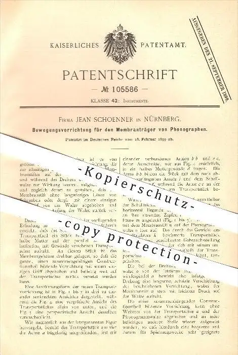 original Patent - Jean Schoenner in Nürnberg , 1899 , Bewegungsvorrichtung für den Membrantäger von Phonographen !!!