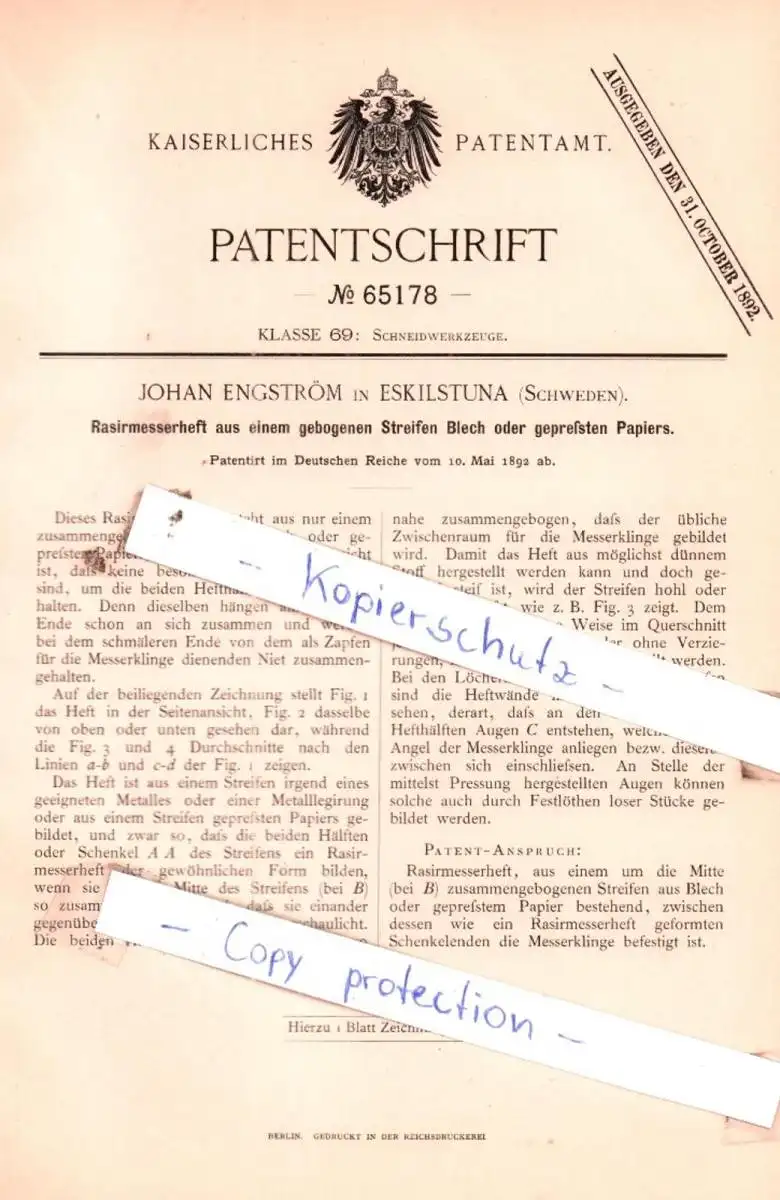 original Patent - Johan Engström in Eskilstuna , Schweden , 1892 , Schneidwerkzeuge !!!