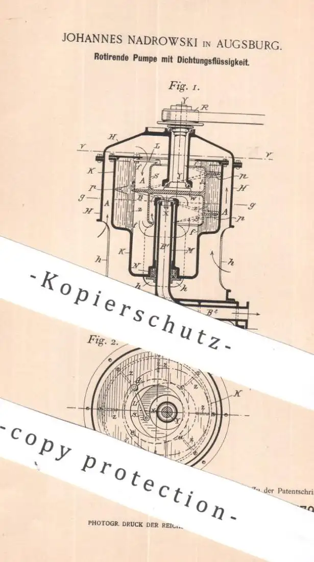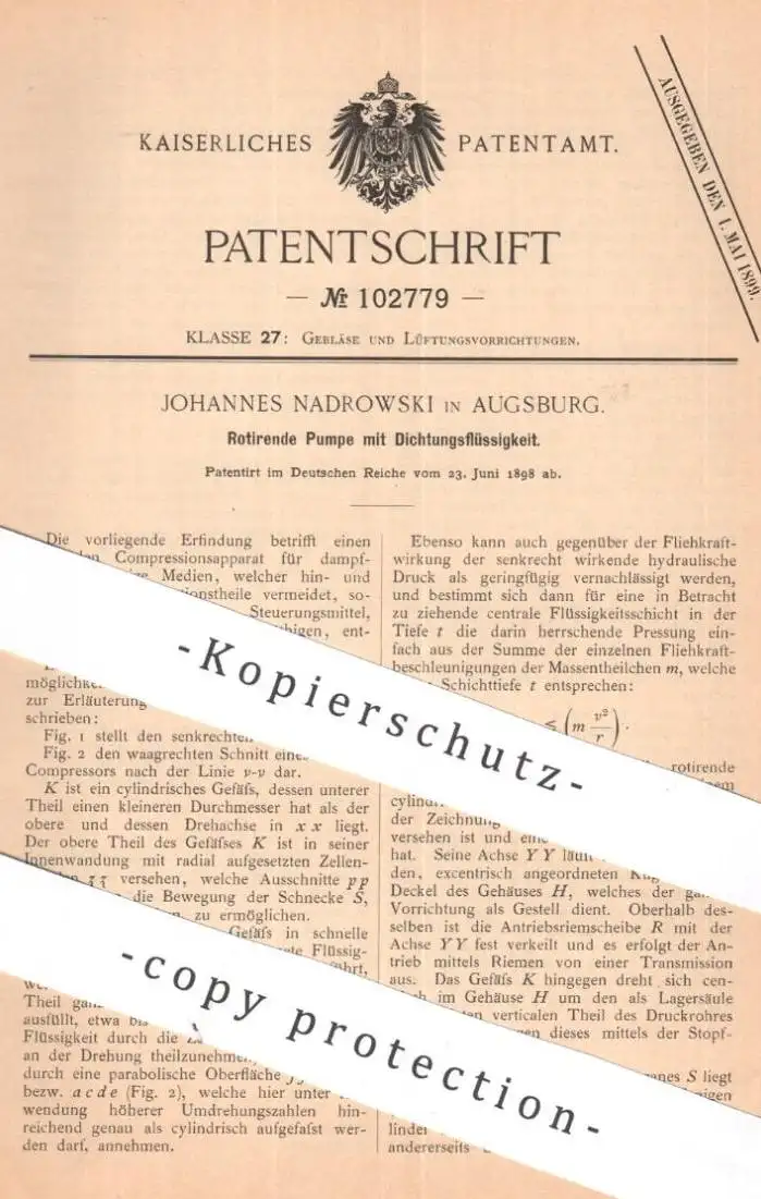 original Patent - Johannes Nadrowski , Augsburg | 1898 | Rotierende Pumpe mit Dichtungsflüssigkeit | Pumpen , Kompressor