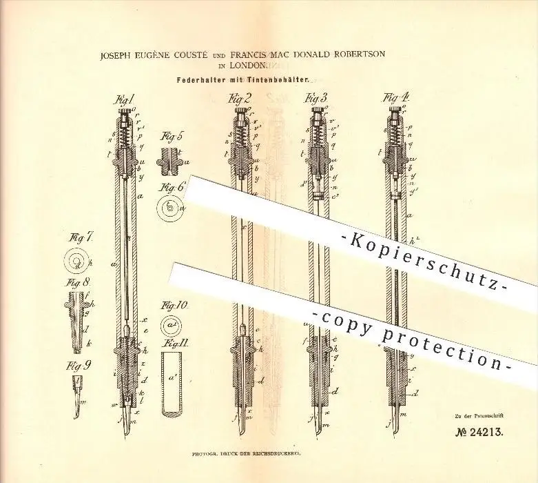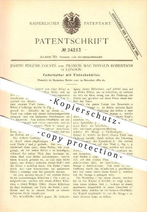 original Patent - Joseph E. Cousté & Francis Mac Donald Robertson in London , 1883 , Federhalter mit Tintenbehälter !!!