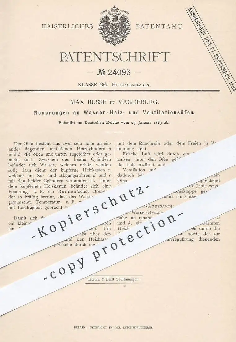 original Patent - Max Busse , Magdeburg , 1883 , Wasserofen , Heizofen , Ventilationsofen | Ofen , Öfen , Ofenbauer !!!