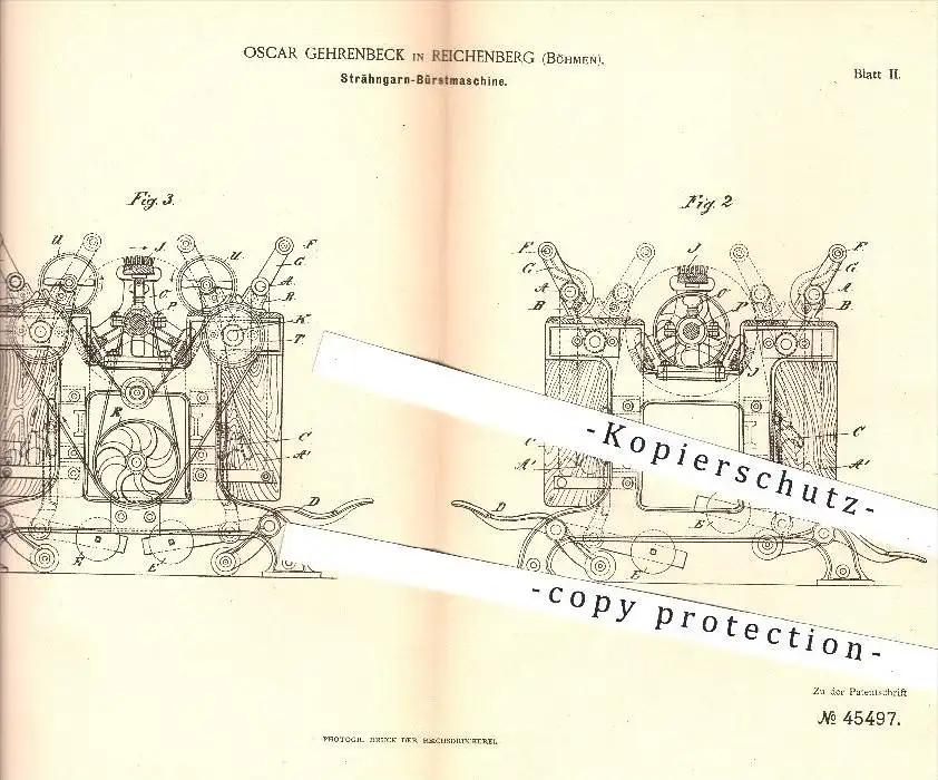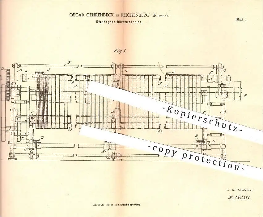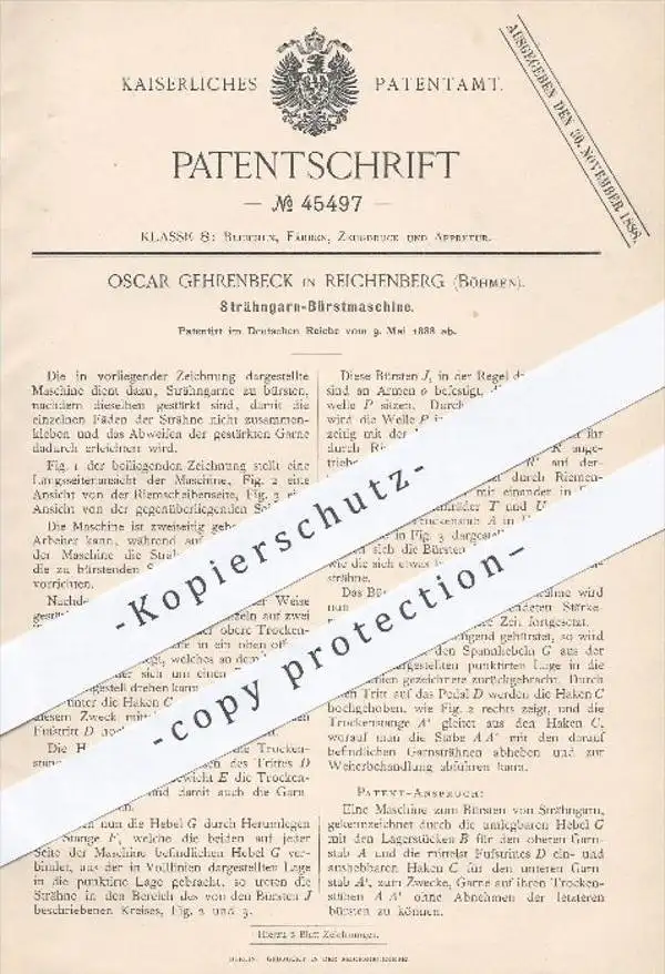original Patent - Oscar Gehrenbeck , Reichenberg , Böhmen , 1888 , Strähngarn - Bürstmaschine | Garn , Bürsten , Fäden !
